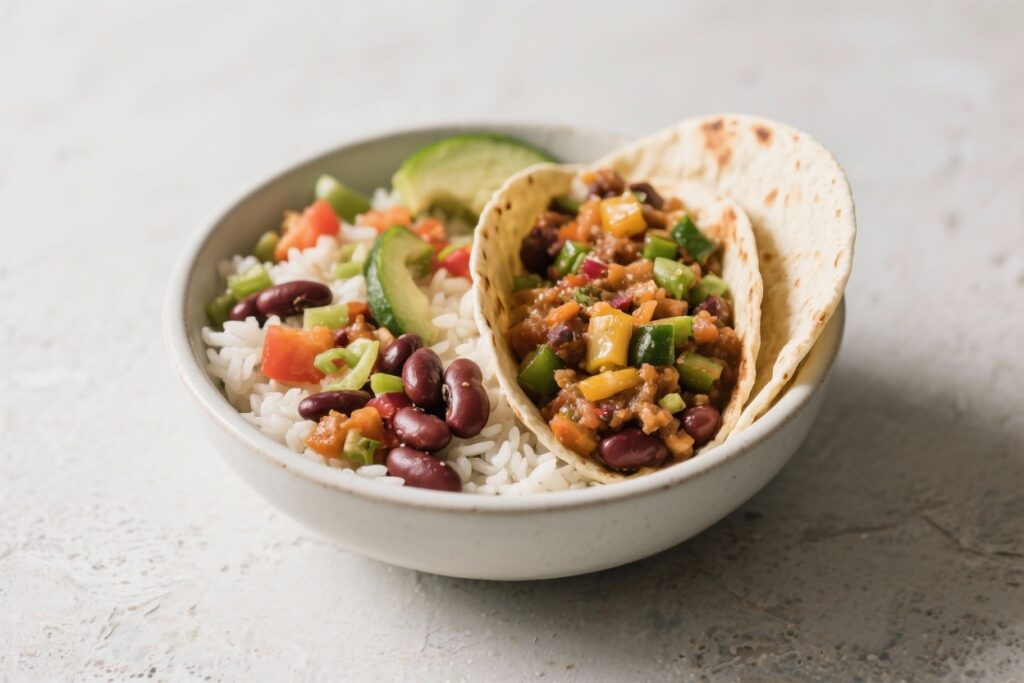 This Veg Bean & Rice Burrito Bowl is everything you want in a quick meal: hearty, colorful, and loaded with
